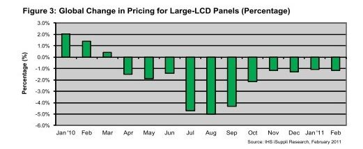 据IHS iSuppli公司的研究,由于需求疲软和库存上升,2月份大型液晶显示器(LCD)面板价格继续下降,但到4月份这种情况可能会有所改善,因届时品牌厂商会增加购买电视面板。