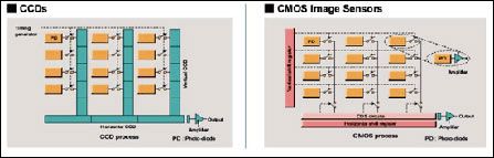 而现在普遍使用的两种图像传感器就是大家经常听说到的CMOS和CCD传感器了,为了让大家最终更好地认识背照式CMOS传感器,小编在此也简单说一下两种传感器的异同以及优缺点。如下图所示,左边为CCD传感器的结构,右边的为CMOS传感器的机构,黄色的小方块为像素点。由图示可以看出,CCD传感器中每一行中每一个象素的电荷数据都会依次传送到下一个象素中,由最底端部分输出,再经由传感器边缘的放大器进行放大输出;而在CMOS传感器中,每个象素都会邻接一个放大器及A/D转换电路,用类似内存电路的方式将数据输出。简单说就是对待单个像素点上得到的电荷数据有不同方法,CCD是全部传输出来再统一处理,CMOS是先分别处理在传出来。这两种方式并不是人们凭空想象出来的,而是由CCD和CMOS的制作工艺决定的,因为CMOS器件内传输数据会有较高的失真,所以需要先做处理。