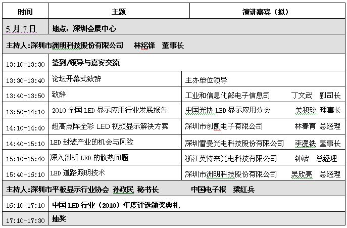 1.讲座 主办方将邀请国内知名LED行业专家分析2010年中国LED产业发展问题、2011年中国LED企业的总战略及调整方向,预测中国LED市场各领域(原材料、设备、外延芯片、显示屏、照明等)的投资情况分析及趋势。