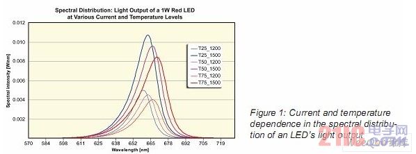 LED的光输出特性主要取决于其工作条件。前向电流增加会使LED产生更多的光。但当前向电流保持不变,光输出会随着LED的温度升高而下降。图1描述了温度,电流和光输出的关系。并且描述了一个LED相关的颜色光谱在峰值波长处的偏移。用于普通照明的单色LED,蓝色光谱的峰值会发生偏移,因此改变了LED所谓的色温。这会对LED照明空间内的感官产生影响。