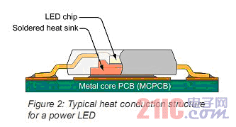 热量从LED封装芯片开始传递,相关的数据由供应商提供。图2中显示的是常见的导热结构。一个LED灯大约50%的结点至环境的热阻由LED封装所引起。