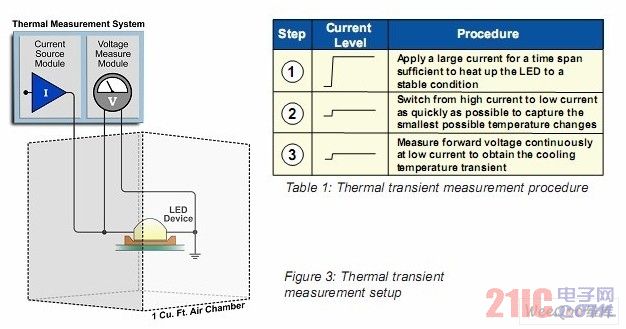 图3描绘了此类测量装置的简图(不成比例)。测量的第一步是确定前向电压在一个非常小的电流下的温度敏感性,这个小电流可以是传感器或测量电流。之后,LED被施加一个大电流,从而使其变热。接着停止施加大电流,并且很小的传感器电流再次出现,同时用一个高采样率完成前向电压的测量,直至LED结温完全趋于稳定。由于LED快速的热响应,所以测量的硬件设备必须能够捕捉LED电流停止施加后几微秒内的温度(电压)改变。如图3所示,被测量的LED处于一个封闭空间内,这个封闭空间是JEDEC标准的自然对流腔,它提供了一个没有气流流通的环境。T3STer也可以提供类似的装置。表格1归纳了测试步骤。