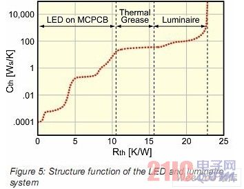 在图5中,最初的曲线非常陡峭,同时热容被加热。这个曲线进行了注解,描述了LED/MCPCB,封固剂(导热硅脂)和照明设备三个阶段。但在第一个阶段内,曲线描述了更小的一些阶段,譬如Dieattach,散热板,甚至是紧固铜散热板和MCPCB的胶水。注意这个图形证实了早期的一个论点,那就是LED自身的热阻占整个系统结点至环境热阻的50%。
