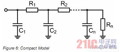 结构函数可以进一步转变成简化模型,也就是一个包含热阻热容的等效网络,它包含了结构函数图形中所包含的所有数值。图6描述了类似功率LED等半导体元件的一个通用模型。当然,实际的模型中R和C会有具体的数值。
