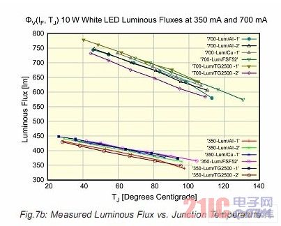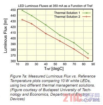 在图7a中显示了两个同一厂商的两个白色LED光通量和参考温度的关系,这两个LED具有不同的散热方式。散热方式1使用了一块金属的PCB板,而散热方式2使用了传统的FR4板。此外,两个LED样品的PCB板和散热器之间使用了不同的导热界面材料。