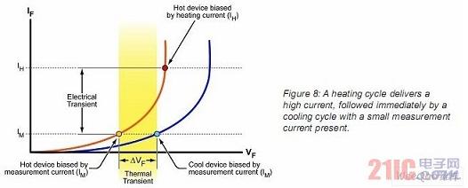 注意,当PN结前向电流突然被停止(在测试过程中),不可避免的发生电瞬态现象。这个瞬态现象会持续很短的一段时间,在这段时间内前向电压的改变无法描述LED芯片的温度的改变。因此,在进行测量时必须给电瞬态现象消失留有一个时间上的延迟。