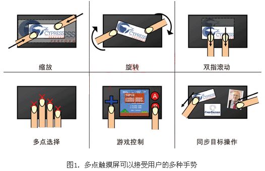 用投射式触摸屏实现的几种常见的多点触摸手势包括手指的张合、缩放、双指的滑动和旋转。它们可以快速方便地处理数据、内容和用户参数。便携游戏和文本/电子邮件应用也可以利用多点触摸技术。在一个多指触摸过程中,多触点APA(全点可寻址)模式可以精确地测定每个手指所按压的坐标位置。