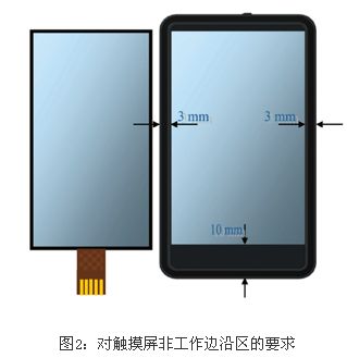 对尺寸小于4英寸(10厘米)的触摸屏,触摸屏的边沿宽度,在触摸传感器尾线一侧应不窄于10mm,与尾线侧毗邻的两侧应不窄于3mm。这个边沿空间用于隐藏把透明的ITO图案链接到控制电路的非透明银质箔线并隐藏控制电路本身。对于使用玻璃基底的触摸屏,边沿的宽度或许可以做得更窄,但仍建议使用上述指导原则。图2 描述了这些指导原则。