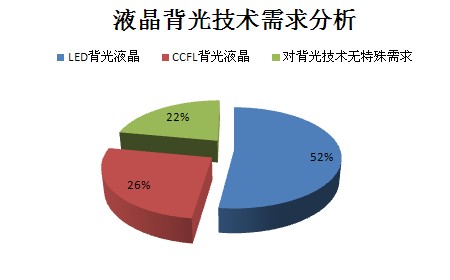 根据赛迪网对350位网友所作的调查显示,在购买显示器的时候,考虑LED产品的有182位,占52%。依旧会考虑CCFL产品的有91位,占26%,而表示不关心背光技术的有77位,占22%。而在1年多以前类似的调查当中,表示会选购LED产品的用户比例还不足25%。由此,很多厂商甚至已经在产品线上实现了全部LED化。而随着LED产品价格的进一步走低,在未来一到两年之内,CCFL产品很有可能会被完全取代。
