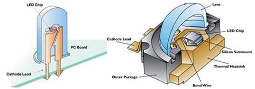 传统炮弹型封装,以插件式运用,广泛运在家电或是通讯产品的指示灯,??吹降难丈辔臁⒒?、绿色光等,但因为大部分LED产生的热只能藉由2根导线,往组装的基板上导热,散热效果不佳。