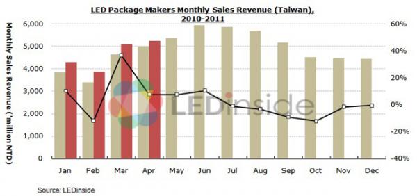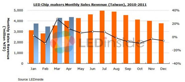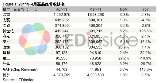 - 011年4月台湾上市上柜LED厂商营收总额约96.2亿元