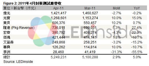 集邦科技(TRENDFORCE)旗下研究部门LEDinside统计, 2011年4月台湾上市上柜LED厂商营收总额约96.2亿元,(MoM+3.39%,YoY+6.6%)。从上游芯片厂营收来看,2011年四月份台湾地区上市柜LED芯片/晶粒厂营收43.7亿元,与去年同期相比,成长8.5%,(MoM+1.8%; YoY+8.5%)。下游LED封装方面,四月份台湾地区上市柜LED封装厂营收达到52.5亿元,与去年同期相比,成长5% (MoM+2.9%,YoY+5%)。整体表现,LED背光源市场稳定拉货,四月营收持平成长。