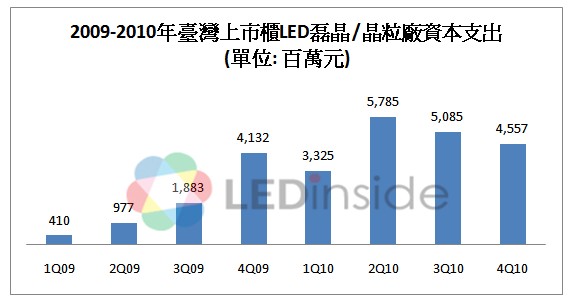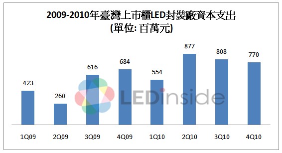 但若从2009年至2010年的资本支出,以季度区分上来看,不论是LED产业上游的芯片或是下游的封装厂,在2010年第二季时皆大幅增加资本支出,以利新建厂房,购置机台设备。尤其是受到中国MOCVD机台设备的补助诱因下,2010年芯片厂的资本支出总额高达187.5亿元。而LED封装厂也受惠于大陆半导体照明政策的推广下,前往大陆主要半导体照明生产基地设立厂房,总计台湾上市柜封装厂的资本支出高达30.09 亿元。