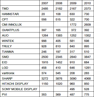 最后,中小显示屏行业在一年内也经历了比较大的变动?;常–PT)和彩晶(HANNSTAR)彻底转型为中小显示屏厂家。CPT在2010年出货量高达3.52亿片,比2009年增长135%;HANNSTAR在2010年出货量高达2.48亿片,比2009年增长505%。虽然出货量大增,但是平均单价不高,毛利低。加上TFT-LCD生产线的高额折旧费用,这两个厂家还处于亏损的泥潭之中。