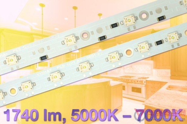 日前,Vishay Intertechnology, Inc.宣布,推出3款安装了6个或12个高亮度LED的冷白光LED???/a>--- VLPC0601A2、VLPC1201A2J、VLPC1201A2。VLPC0601A2在一个240mmx14mm的PCB板上装了6个LED,光通量为870流明;VLPC1201A2J在240mx14mm的PCB板上安装了12个LED,光通量为1740流明;把VLPC1201A2J简单地分成两半,每一半就是一个VLPC1201A2模块,每个??榈某叽缡?20mmx14mm,装有6个LED,光通量为870流明。这些模块使设计者能够为其应用选择最合适的PCB和光强。
