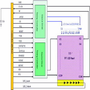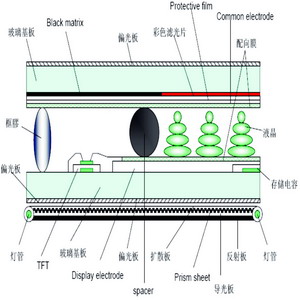 从TFT-LCD的切面结构图(图1)可以看到LCD是由二层玻璃基板夹住液晶组成的,形成一个平行板电容器,通过嵌入在下玻璃基板上的TFT对这个电容器和内置的存储电容充电,维持每幅图像所需要的电压直到下一幅画面更新。液晶的彩色都是透明的必须给LCD衬以白色的背光板上才能将五颜六色表达出来,而要使白色的背光板有反射就需要在四周加上白色灯光。因此在TFT-LCD的底部都组合了灯具,如CCFL或LED。