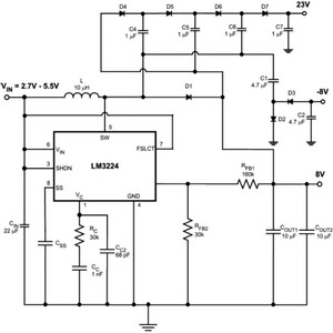 如今各种微型电压升降压芯片技术也日显成熟,产品也在不断增加,符合PMP/MP4、DSC、DV的TFT-LCD需要的,能同时多路输出它们需要的不同电压的集成电源管理芯片组(SOC)也在迅速推出之中。TFT-LCD显示器系统需要多档电源电压,如PMP/MP4常用的三星3.5_和4_的TFT-LCD,它们的结构如图3所示,它们由TFT玻璃(TFTglass)、颜色滤波器(Colorfilter)、显示区(Displayarea)、背光板和背光源(Backlight)四部分叠加组成。图4是三星3.5_的TFT-LCD电路图。它们的主要技术参数是:VIN=2.1-4.0V,VSW=15V/1.4A、VS=15V;用6个LED串联做背光源,每个LED的VF=3.4V、IF=20mA,因此需要一个24V/50mA的电压来驱动。常常选用带电感的DC/DC来升压,再加上倍压电路,输出多档电源电压满足TFT-LCD的需要,如图5所示。目前MP3、PMP/MP4、DSC、DV等的小尺寸TFT-LCD屏的低成本背光驱动方案常常是采用这种方法来设计实用电路的。