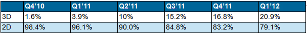 表一 Q4’10-Q1’12 2D和3D液晶电视面板占比分析