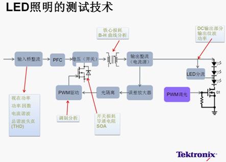 要达到高品质的驱动电源设计标准,就需要进行全面的测试测量分析,如图1所示,LED照明测试主要包括5个部分:电源质量、谐波、功率开关器件测量、调制分析以及驱动输出参数测试。