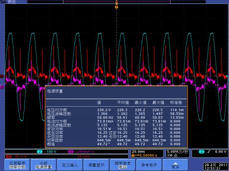 测量驱动电源的输入功率、功率因数和谐波有很多方法,使用具有电源分析功能的泰克示波器产品可以轻松实现这些电能质量测量。使用一路通道测量输入电压、一路通道测量输入电流,配合示波器内置的PWR电源分析软件,所有的电能质量相关参数可以直接显示在屏幕中。