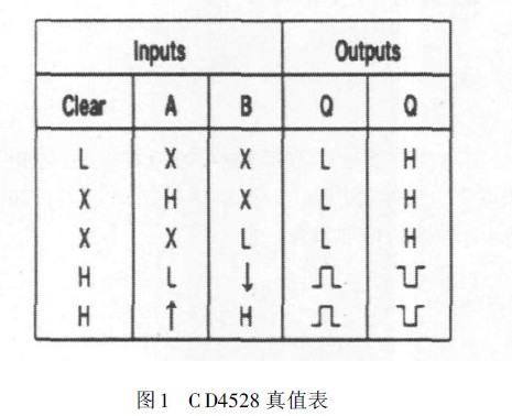 CD4528含两个单稳态触发器,其真值表如图1。芯片3脚与13脚分别为其内部两个独立单稳态电路的Clear 端,5脚和11脚为单稳态的B输入端,4脚与12脚为单稳态的A输入端。B端接高电平,只有当Clear端为高电平时,A端输入的上升沿触发才会有效。
