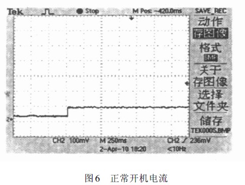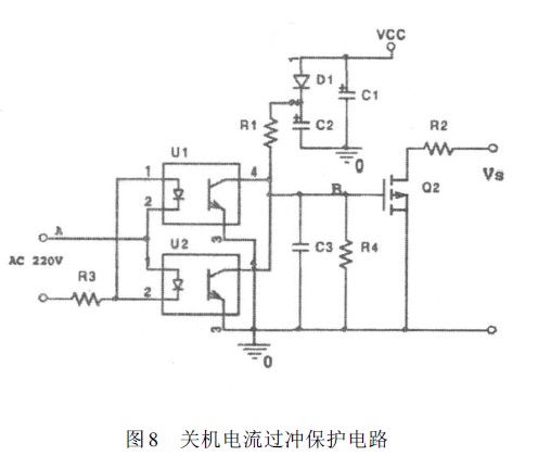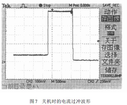 图8 为关机电流过冲?;さ缏罚玫缏纺茉?ms内迅速检测出交流电源是否关闭,并且在电源关闭后强行将调节器给定输入端的电压拉低,防止电流过冲,具体动作过程如下。