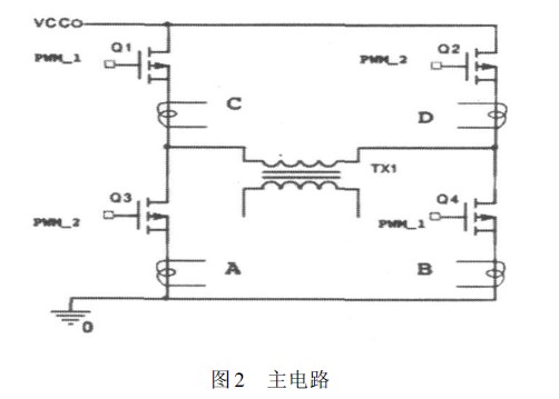 PWM1与PWM2为PWM芯片输出的两路互补脉冲信号,主电路(见图2)中Q1、Q4的驱动与图3中PWM1同步,Q2、Q3的驱动与PWM2同步。 在A、B、C和D4点进行电流上升率采样然后转变为电压信号,并分别给图3中的直通信号1与直通信号2。