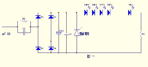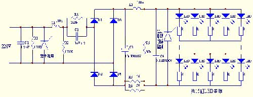 在图三电路中﹐C1﹑R1﹑压敏电阻﹑L1﹑R2组成电源初级滤波电路﹐能将输入瞬间高压滤除﹐C2﹑R2组成降压电路﹐C3﹑C4﹑L2﹑及压敏电阻组成整流后的滤波电路。此电路采用双重滤波电路﹐能有效地?;ED不被瞬间高压击穿损坏。