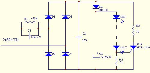 在图二电路中﹐可控硅SCR及R3组成?;さ缏珐o当流过LED的电流大于设定值时﹐SCR导通一定的角度﹐从而对电路电流进行分流﹐使LED工作于恒流状态﹐从而避免LED因瞬间高压而损坏。