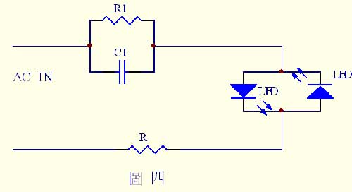 图四是一个最简单的电容降压应用电路﹐电路中利用两只反并联的LED对降压后的交流电压进行整流﹐可以广泛应用于夜光灯﹑按钮指示灯﹐要求不高的位置指示灯等场合。