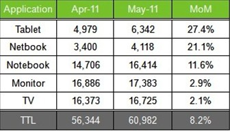 此外正规平板电脑用面板出货表现依旧维持成长态势,较前月成长27.4%,出货量来到634万片。上网本用面板受到二线白牌厂商采用,搭载在类平板电脑机产品上,也持续带动5月份出货总量来到411万片,较4月增加了21.1%。