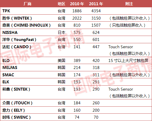 全球14大触控屏厂家2010-2011年(预测)收入排名(单位:百万美元)