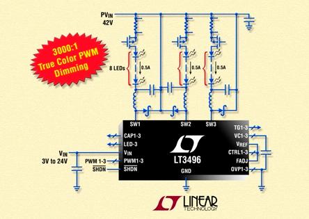 凌力尔特推出2MHz DC/DC转换器LT3496,设计该器件以用作3通道恒定电流LED驱动器。LT3496的每个通道都可以驱动多达8个串联的 500mA LED,因此该器件能以高达96%的效率驱动多达24个500mA LED。所有3个通道都以独立的True Color PWMTM 信号工作,因此每个通道都能以高达3000:1的调光比独立调光。固定频率、电流模式架构确保在宽电源电压和输出电压范围内稳定工作。频率调节引脚使用户能够在330kHz至2.1MHz范围内对频率编程,以优化效率,同时最大限度地减小外部组件尺寸。耐热增强型4mm×5mm QFN 封装允许LT3496为50W LED应用组成占板面积非常紧凑的解决方案。