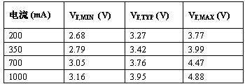 表 1:大电流白光 LED 的正向压降与驱动电流。