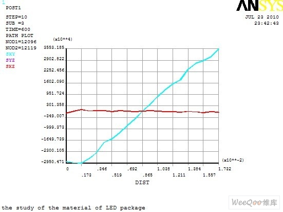 图10 显示了路径上剪应力的变化情况,SYZ 与SXZ 几乎重合,且剪应力很小,变化平缓;SXY 变化非常剧烈,说明在Y 方向上,即基板与热沉之间有较大的剪应力,且由中间向两端增大,表明剪应力主要集中在边角区域。这是由于基板与热沉为两种不同的材料,材料之间的热膨胀系数及弹性模量不同而产生较大剪应力。