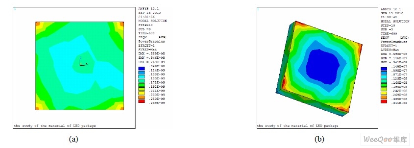 图6 Lumileds 1 W LED 键合层(a)和芯片(b)的等效热应力分布