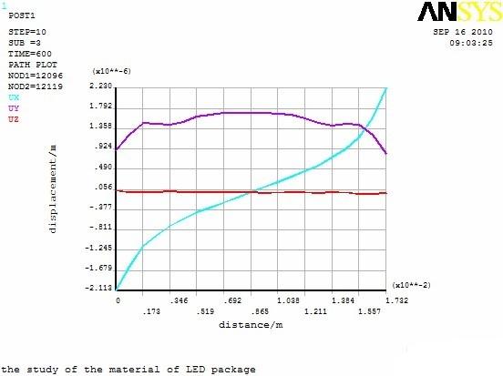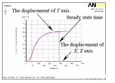 图7 Lumileds 1 W LED 芯片中心节点位移随着时间变化曲线