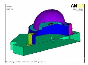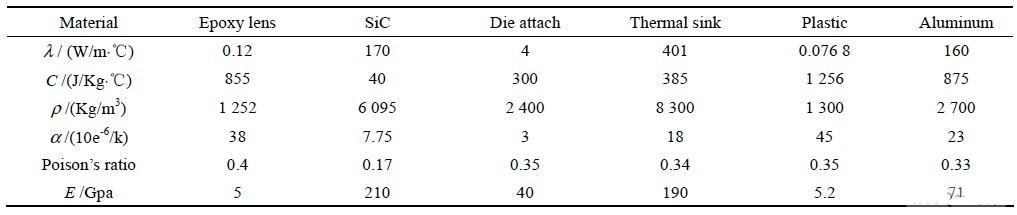 以Lumileds 的1 W 功率型LED 器件(如图1)为研究对象,该LED 由透镜、芯片、键合层、热沉、基板及塑封料组成。热量由芯片经键合层传导到热沉,最后由基板与空气进行对流散热。LED 各种封装材料热性能参数如表1 所示。