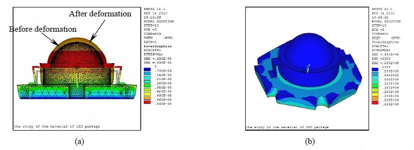 图4 Lumileds 1 W LED 的热变形云图(a)和等效应力云图(b)