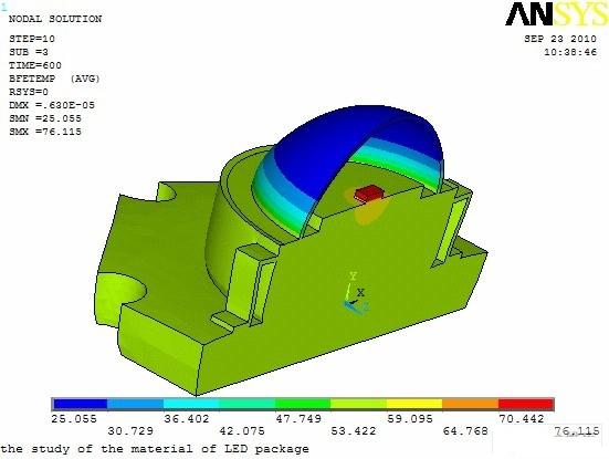 为了验证有限元仿真的可靠性,设计了一组实验对Lumidleds 1 W LED 进行温度测试,测点为铝基板底面中心,给定电流350 mA,电压3 V,温度测试时间为10 min,每隔10 s 记录一次数据,实验结果表明点亮8 min 后,LED 基本处于热平衡状态,此时基板中心温度为56℃。仿真结果表明此时LED 结温为76.1℃(如图2 所示)。