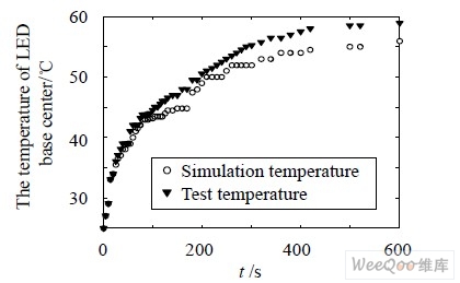 图3 Lumileds 1W LED 基板中心点温度实测数据与仿真数据对比