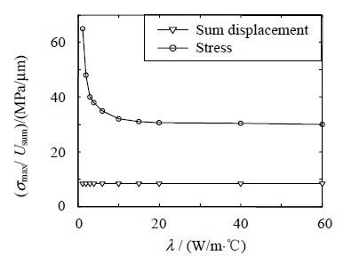 图12 表示LED 芯片最大等效热应力及最大应变,随着键合层导热系数的变化。芯片的应变几乎不变,与导热系数无关;而芯片受到的热应力随着导热系数增大迅速减小,但增大到一定值后,热应力变化趋于平缓,与键合层导热系数改变对温度场的影响趋势相吻合。这是由于整个传热过程中,键合层的导热系数最低,芯片到热沉热阻较大,导致LED 结温较高,温度梯度较大,使得热应力比较集中,因此键合层的材料选取对改变LED 结温和热应力有至关重要的作用。