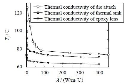 图11 表示LED 结温随着器件各层材料导热系数变化趋势。