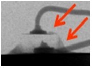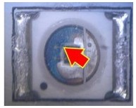2. 变色:这类失效是指LED不点亮的状况下,外观颜色或胶材透明度与新品不同,用肉眼即可看出,通常在产品使用一段时间或在做完可靠度试验后发生。一般说来,变色区域大致可区分为发生在导线架或封装胶材两类,若发生在导线架,通常是因为表面与环境中的化学物质发生反应,如氧化或硫化,要分辨属于哪种需仰赖成份分析,可使用的仪器包含有EDS(Energy Dispersive X-ray Spectroscope)、XPS(X-ray Photoelectron Spectrometer)、AES(Augur Electron Spectroscope)等等。若是封装用的胶材发生变色,则属于高分子材料的劣化现象,如环氧树脂易受高温或是紫外光影响而变黄,因此白光LED多改采矽胶取代之。分析此类失效应特别留意,因胶材本身有一定的透明度,有时变色的导线架因被胶材盖住而误判为胶材变色,引导至错误的改善方向。