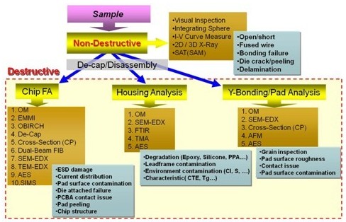 从上可知,一个LED产品的失效,起因可能来自于该产品的任何一个部份,故必须抽丝剥茧方能找到真正的失效原因。针对失效来自LED灯粒而言,因完整的LED灯粒中,LED chip本身很强壮,但包复chip的封装材料则易遭受损伤,因此,LED灯粒的失效多可归因于封装材料的破坏或劣化所导致。若要充分解析这类失效,牵涉到光学、化学、材料学、电子物理学等领域的专业知识,并搭配精密的仪器与丰富的实务经验,才能确认失效点并推导真因,进而提出改善对策。