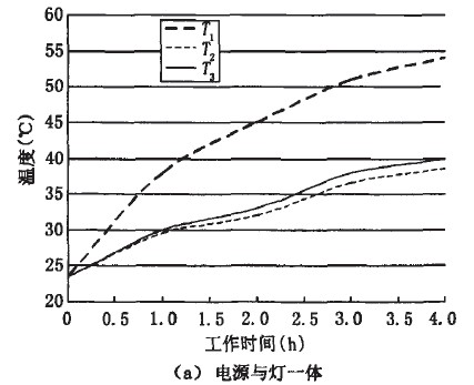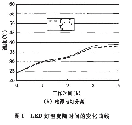 由于电源本身产生一定的热量,使得LED灯上的热量来源增加。同时,电源与灯一体设计使得LED灯整体受热不均,这些因素都会导致灯具发生疲劳和早期失效,而影响其寿命。图1为LED灯温度随工作时间的变化曲线,图中T1为放置电源处温度,T2为远离电源处温度,T3为灯体中心温度。从图中看出,随着工作时间的增加,图1(a)中T1远大于T2和T3;图1(b)中T1与T2两曲线重合,T3略大于T1和T2。可见分离电源后,整灯的温度分布很均匀。