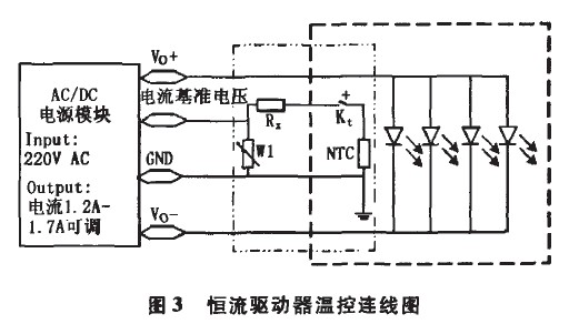 图3为恒流电源给LED灯供电控制原理图。电源的指标为:220V AC输入,电流1.2一1.7A可调,电压自适应(36~39V)。图3中左侧细虚线框中部分为控制电路,其中W1为可调电阻器;NTC为负温度系数热敏电阻;Kt为常开温度继电器,其闭合温度为56℃,自动断开温度为45℃;Rx为匹配电阻。图3右侧粗虚线框中部分为LED??椴糠?。温度继电器和热敏电阻安装在LED??樯希⒂肽?榻裘芙哟?,以便将LED的温度信息反馈给控制电路。常温下Kt