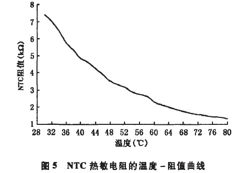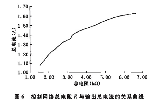 控制电路阻值与输出总电流的关系列于表1,其中R为控制电路的等效电阻。经过在恒温箱中测试,每2℃记录1组数据得到如图5所示的NTC热敏电阻的温度一阻值曲线。该方案中,驱动电源通过接收到反馈的温度信息来控制输出电流,根据图5中NTC的温度与阻值的关系,只要找到输出电流随总阻值的变化关系(如图6所示),再进行适当的电阻匹配,便可找到温度与驱动器输出电流的关系。