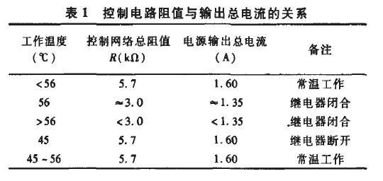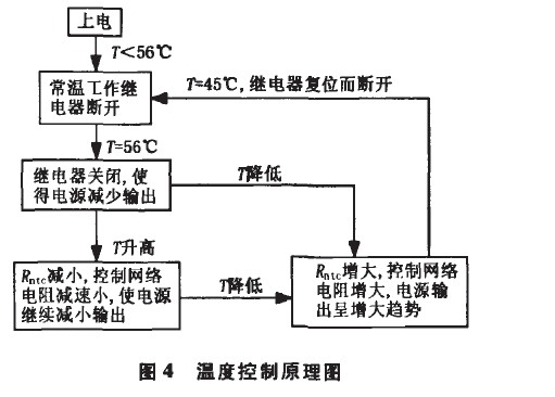 处于断开状态,此时控制电路中只有W1起控制作用,设定常温工作总电流恒定为1.60A。当继电器温度上升到56℃时,Kt自动闭合,整个控制电路开始工作,以减小恒流电源的输出;当温度降低到45℃时,Kt自动断开,电源额定输出。该过程可用图4表示,图中T为Kt的温度,Rntc为NTC的阻值。
