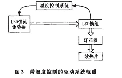 此方案通过控制驱动器的输出电流来实现对LED灯的温度控制。图2为恒流驱动器驱动LED灯框图,驱动器输出到LED模组,LED模组上产生的热量通过良好的导热材料传导到灯芯板,最后经由散热片散热到大气中。当外界散热环境恶劣时,LED模组的温度会达到温度控制系统设定的温度,得到反馈的信息后,驱动器减少输出,达到限制并降低LED模组温度的目的。
